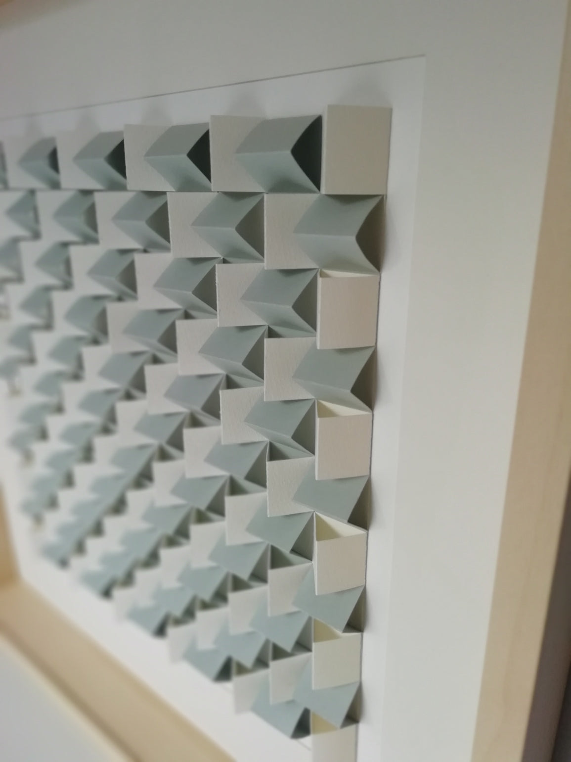 Sculpture murale explorant les principes du minimalisme et de l'art cinétique. La répétition d'un motif géométrique simple crée une œuvre dynamique où la lumière joue un rôle essentiel. Selon l'angle de vue et l'éclairage, l'œuvre se transforme, révélant sans cesse de nouvelles facettes. Le papier blanc amplifie ce dialogue entre matière et lumière.