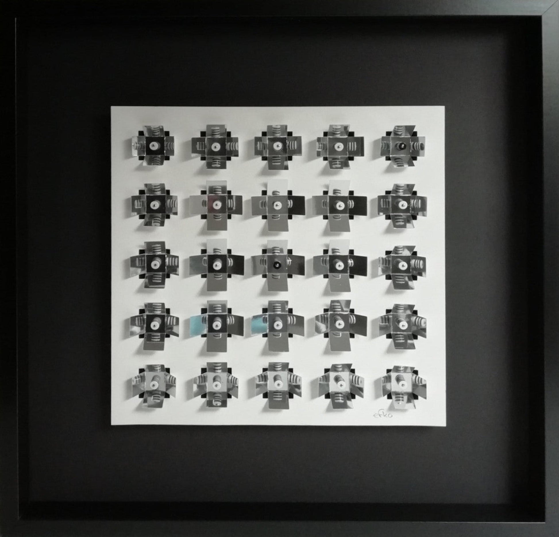 This original and playful artwork presents a composition of twenty-five miniature film and theater projectors, meticulously arranged in a 5x5 grid. Each small projector is crafted with remarkable precision, faithfully reproducing the characteristic details of this professional lighting equipment.